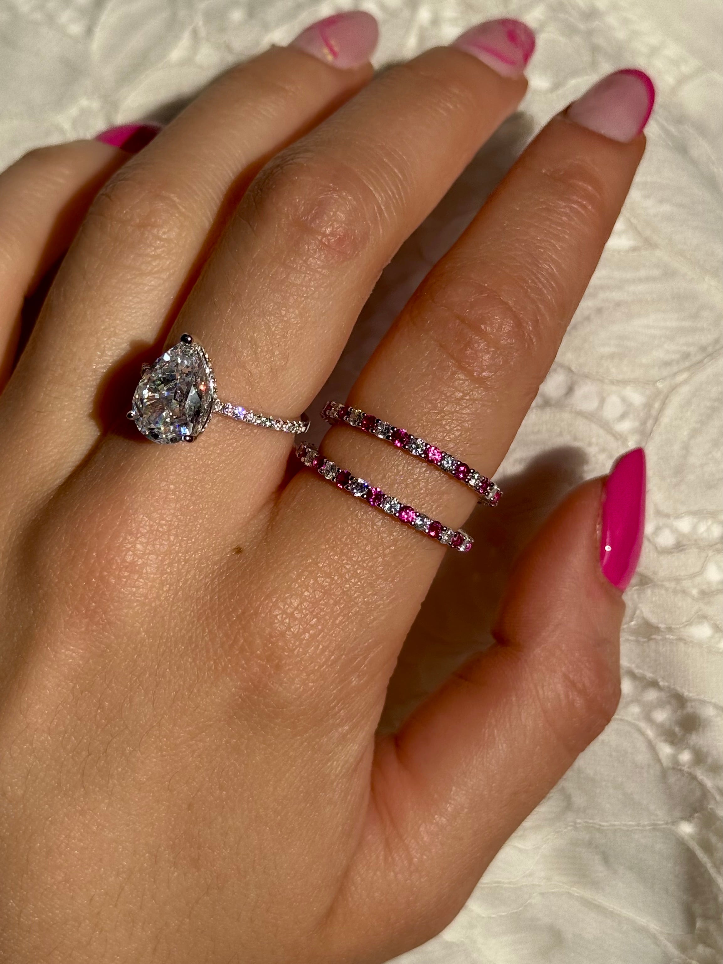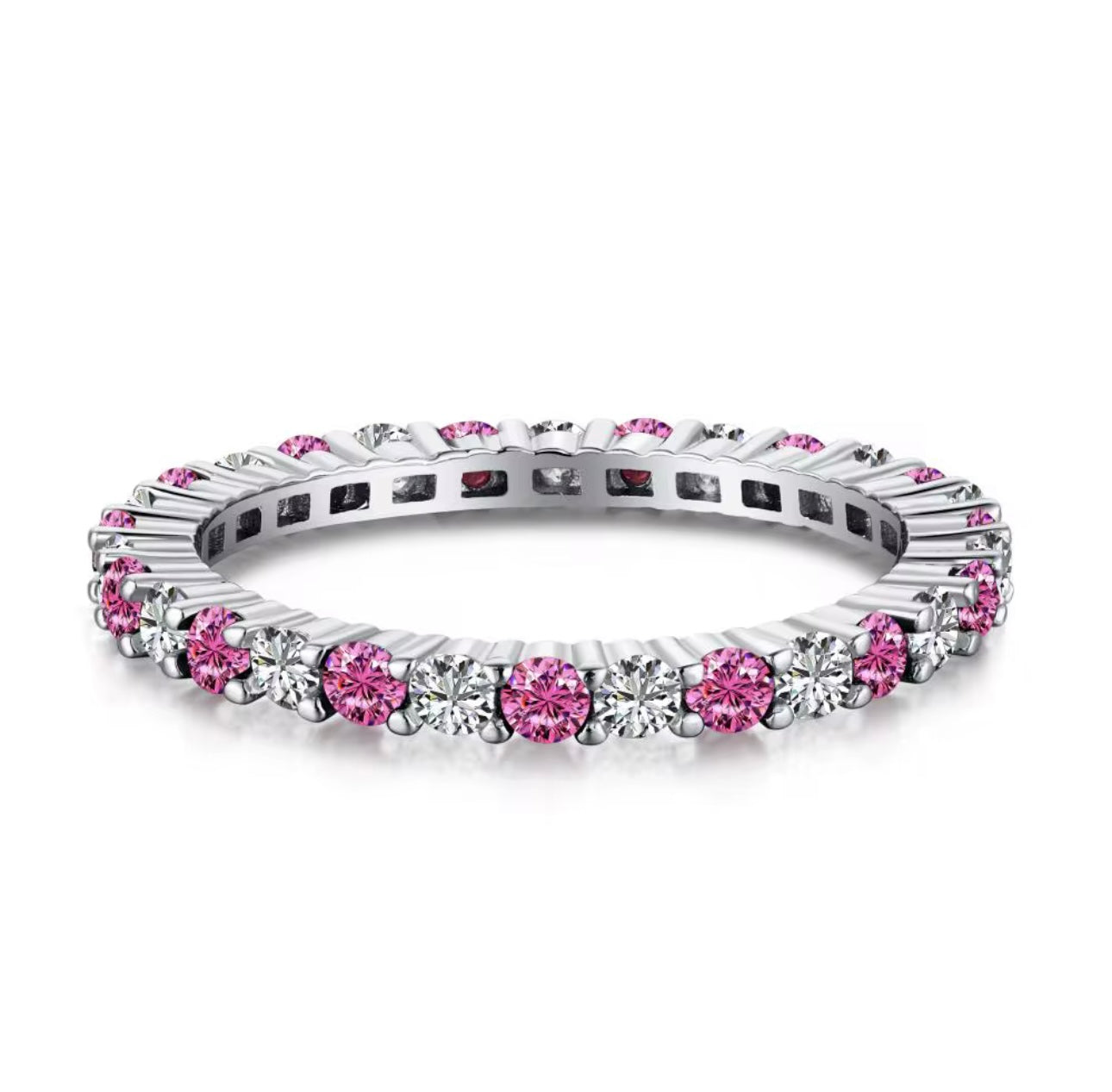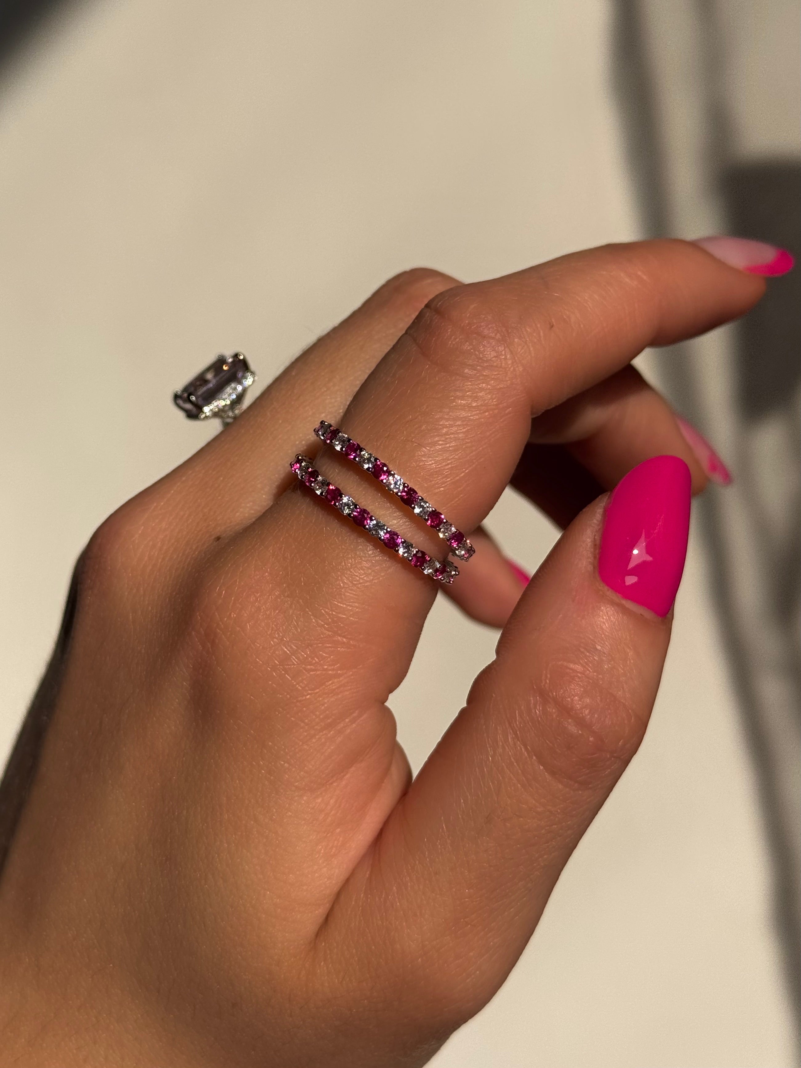 Il design è impreziosito da zirconie cubiche 5A incastonate lungo tutto il gambo in una raffinata sequenza bianco-rosa, per un effetto visivo romantico ma moderno.