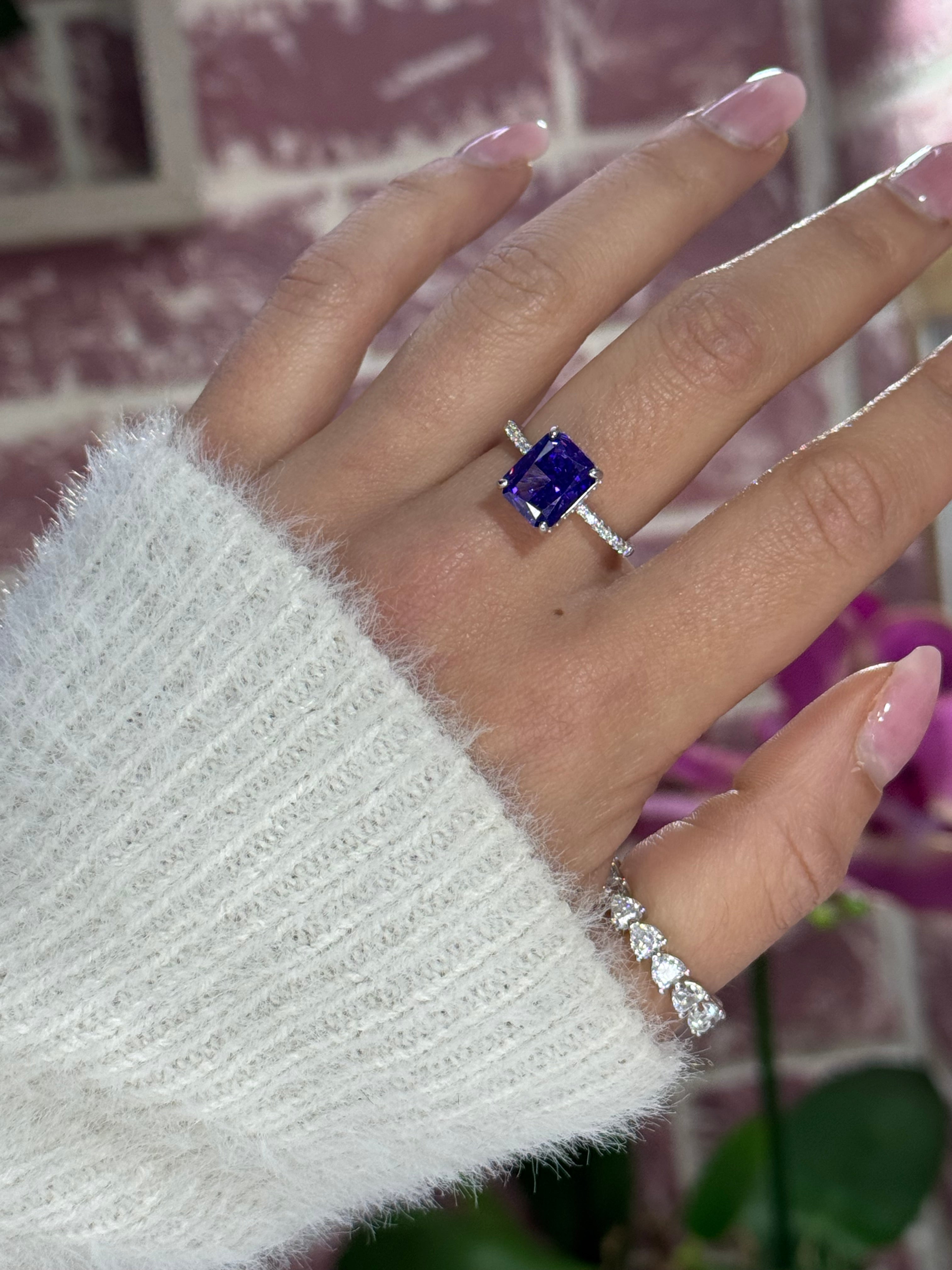 La pietra centrale è valorizzata da una montatura alta con quattro griffe, che la solleva e le permette di catturare al meglio la luce, esaltandone la brillantezza.